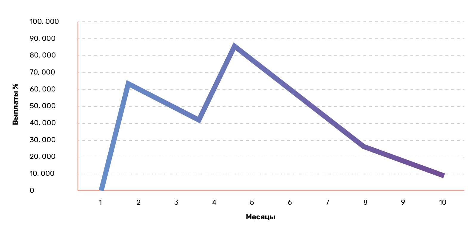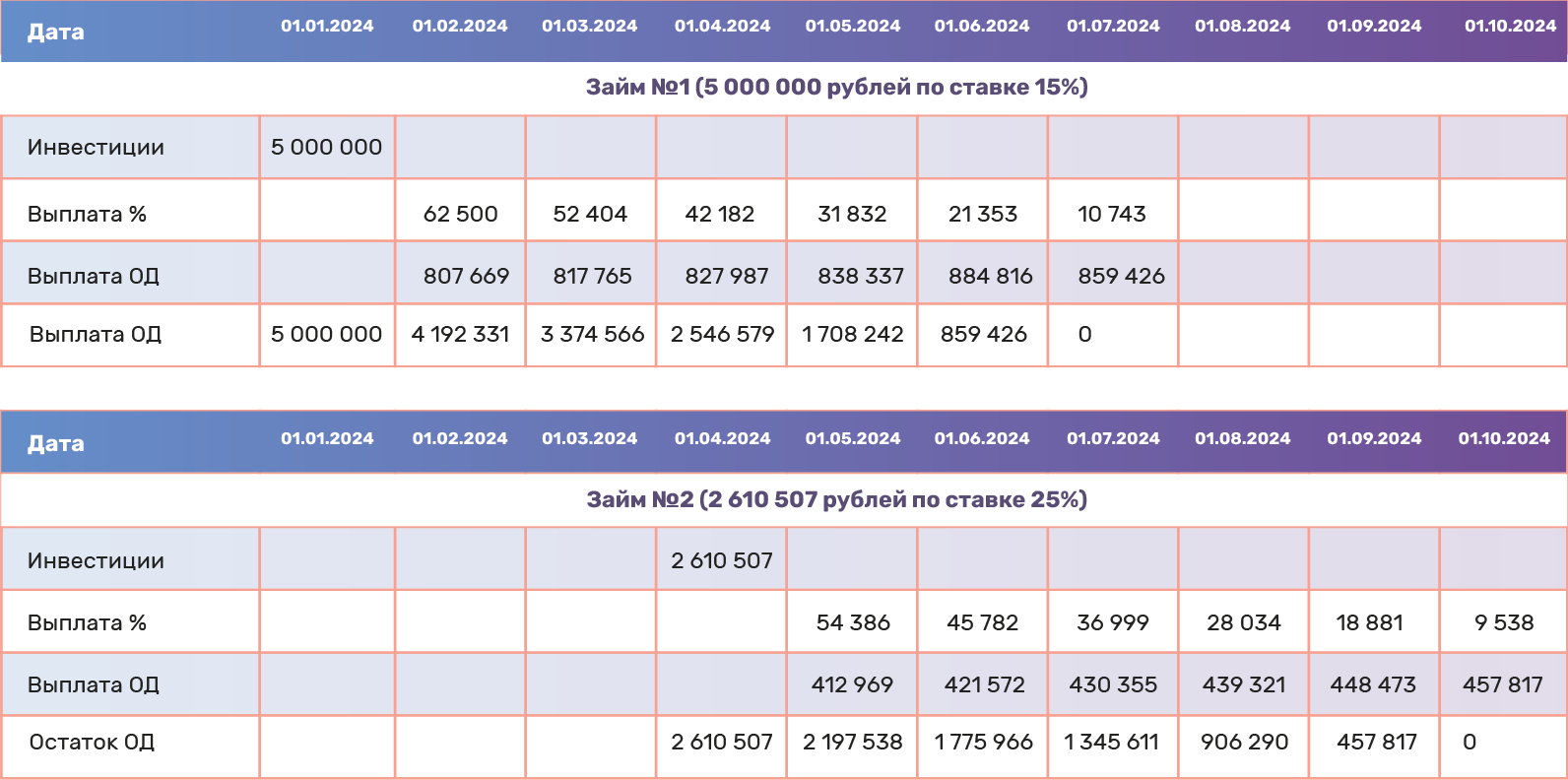 Предположим, вы инвестировали на Ко-Фи в два проекта с разными ежемесячными платежами на шесть месяцев: 1 января 2024 года — 5 000 000 рублей по ставке 15% и 1 апреля 2024 года — 2 610 507 рублей по ставке 25%. В этом случае ваш денежный поток по займам будет выглядеть следующим образом: